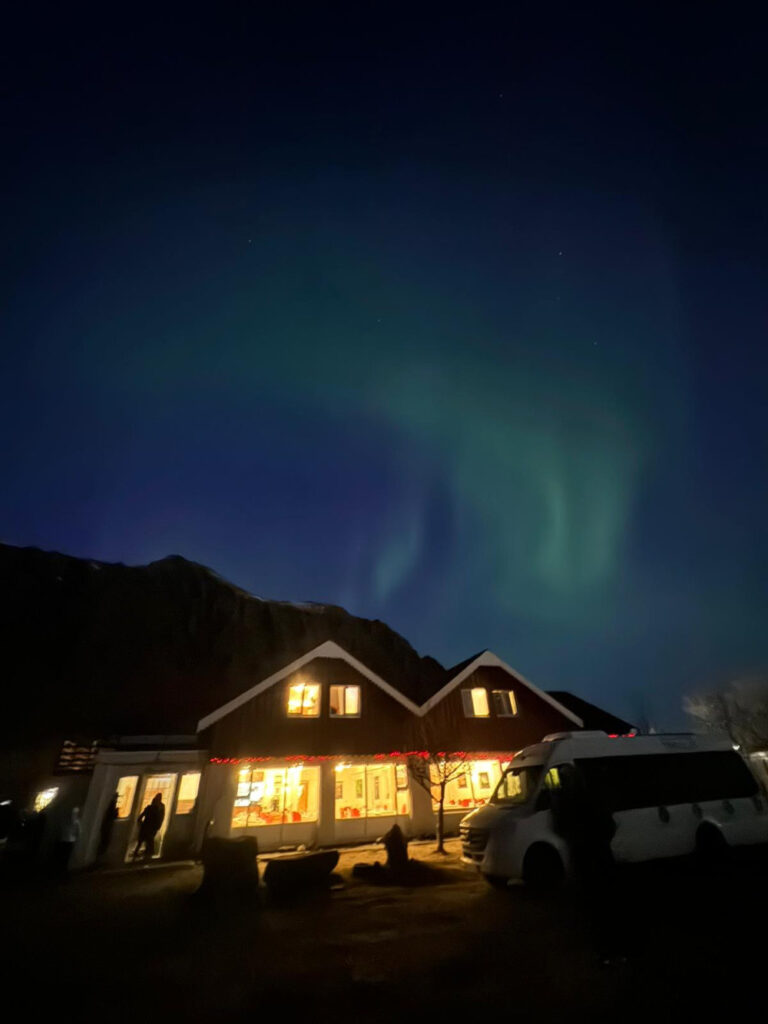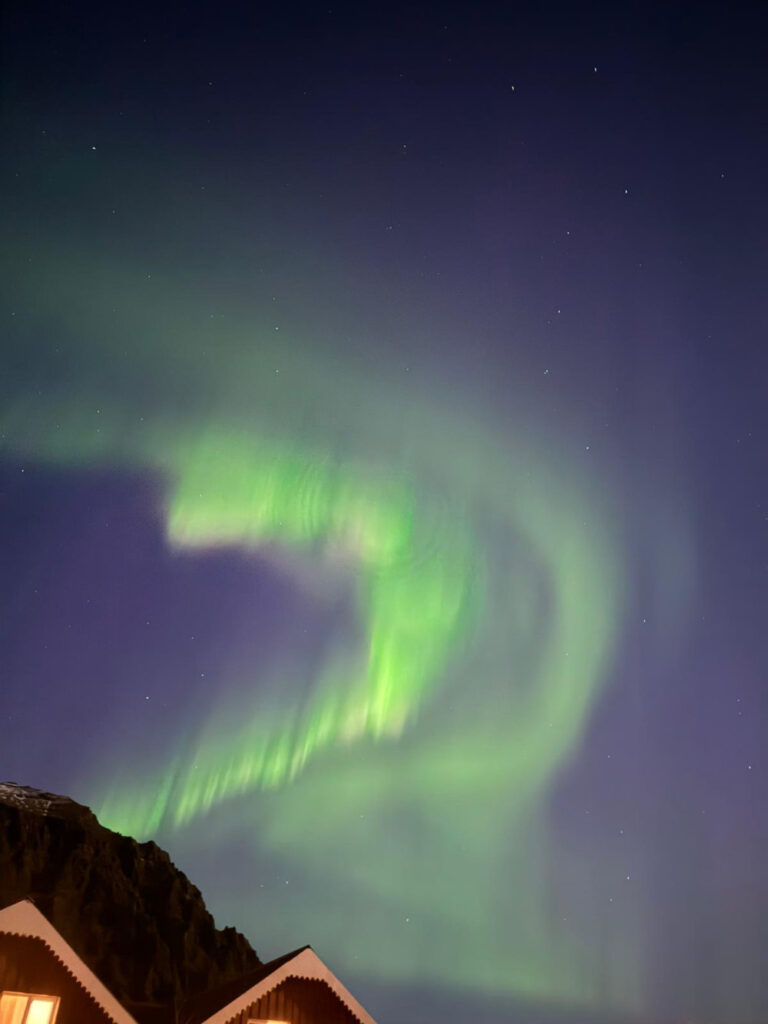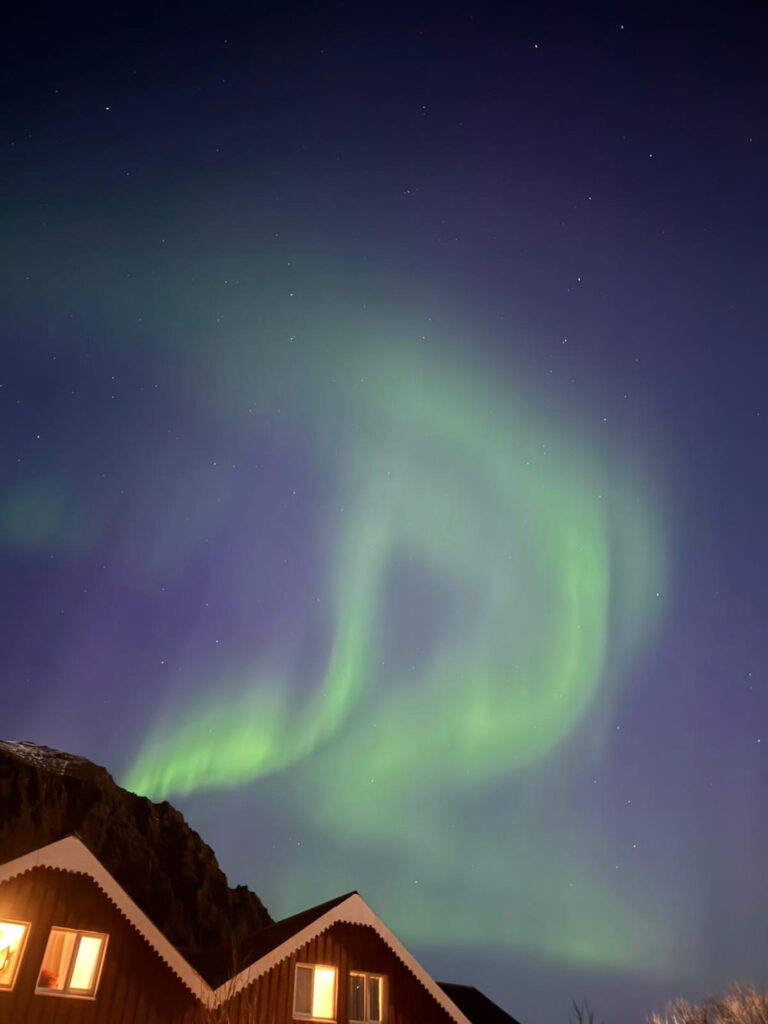 Non c’è niente di più magico che vedere l’aurora boreale danzare nel cielo notturno. Ho atteso pazientemente con gli occhi puntati verso l’orizzonte e quando le prime luci verdi hanno iniziato a squarciare la notte, il mio cuore ha sussultato. Peccato non avere avuto con me un cellulare tanto performante da poterla immortalare!